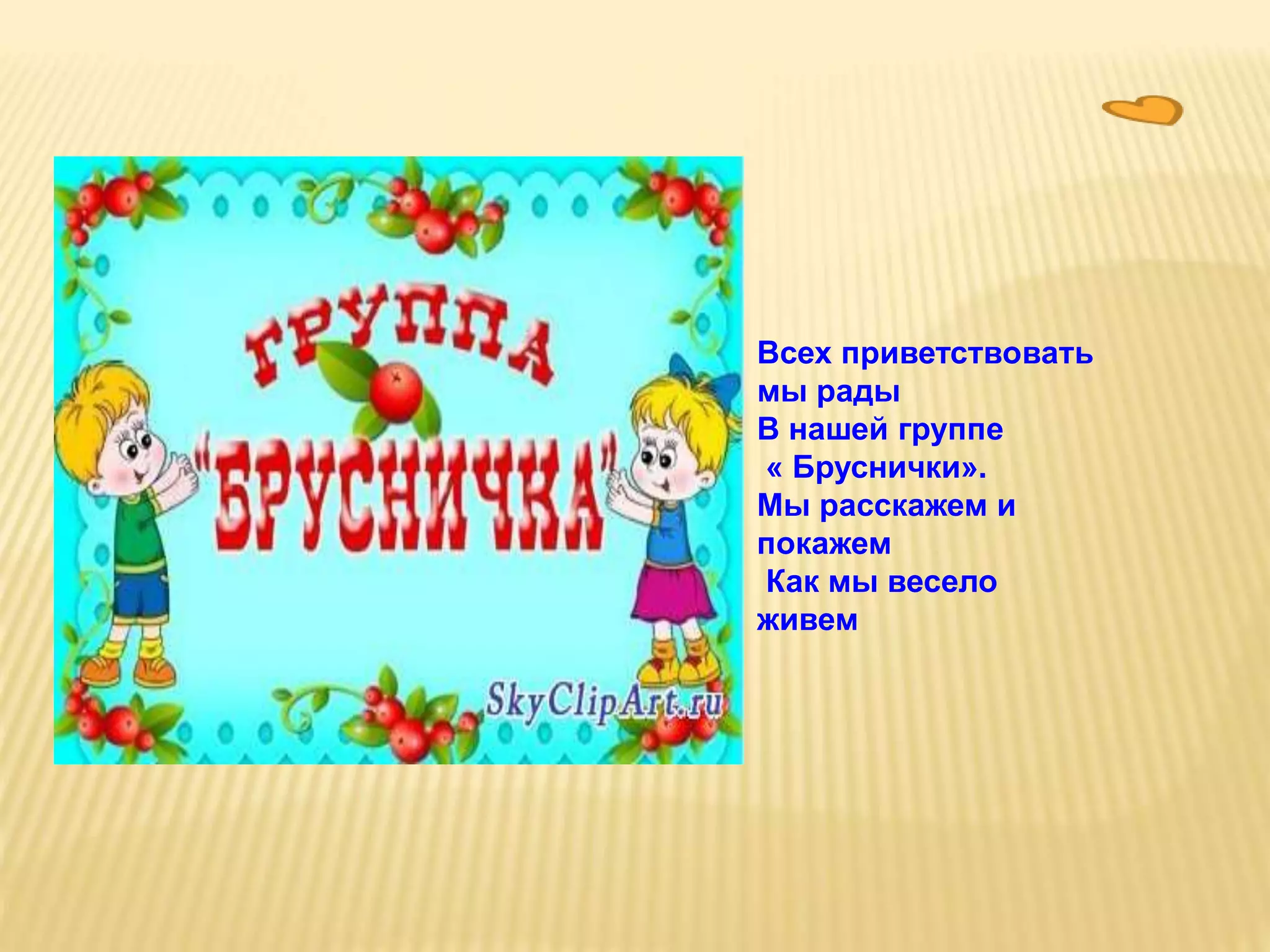 Документ представляет собой приветственное сообщение группы детей «бруснички», которая рассказывает о своем спортивном уголке и разнообразных занятиях. В группе есть разные зоны для игр и развития, где дети могут учиться и творить, а также уголок природы и магазин с молочной продукцией. Воспитатели завершают сообщение на позитивной ноте, обещая интересное времяпрепровождение для детей.
