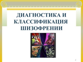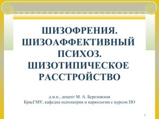 Документ представляет собой подробный обзор различных форм шизофрения и связанных с ней расстройств, включая шизоаффективный психоз и шизотипическое расстройство. Описываются клинические характеристики, диагностика, классификация заболеваний и их вариации, а также психопатологические симптомы, присущие каждому из состояний. Значительное внимание уделяется дифференциальной диагностике для различения перечисленных состояний и оценке их прогноза.