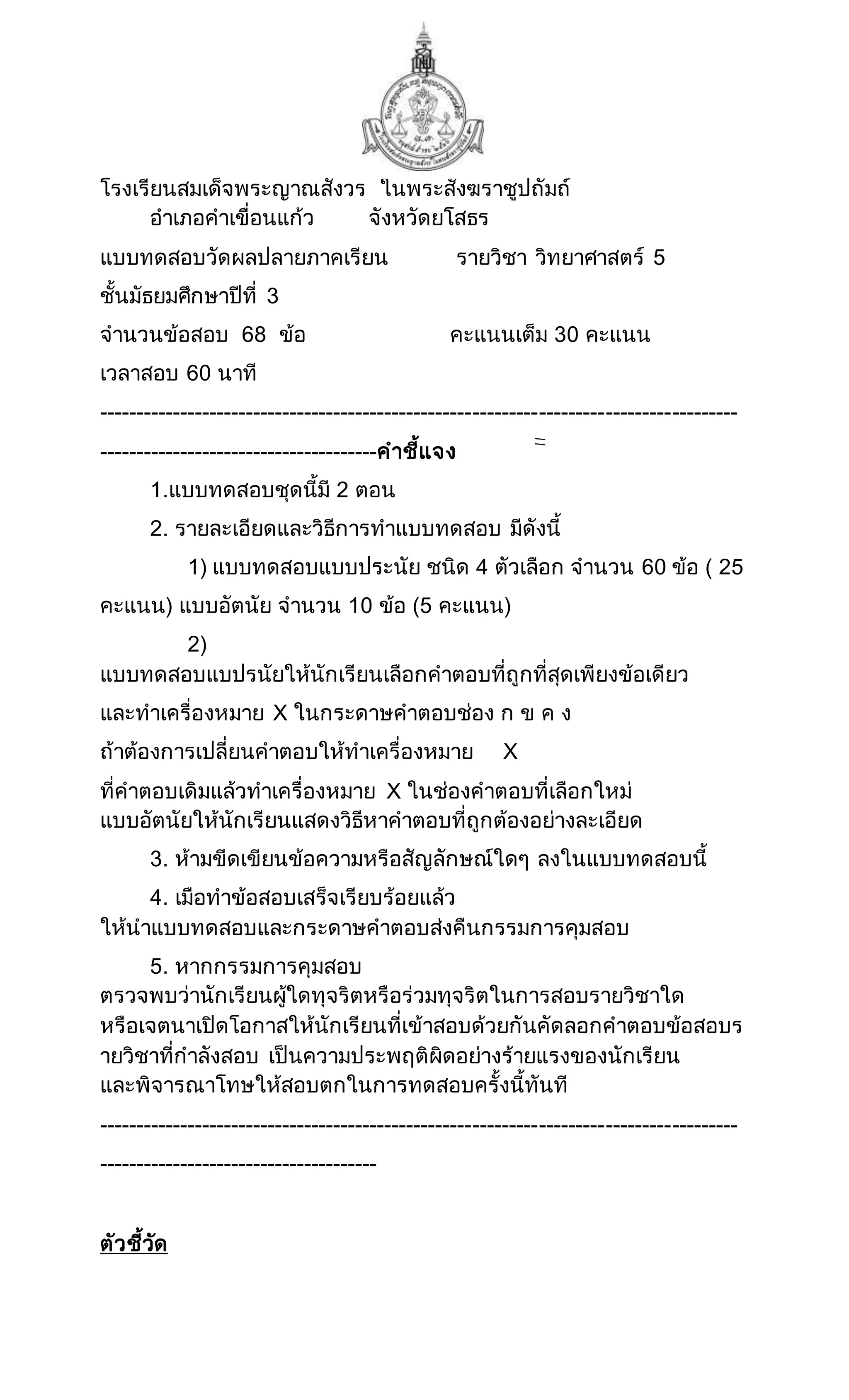 รายวิชา วิทยาศาสตร์ 5 ชั้นมัธยมศึกษาปีที่ 3 จานวนข้อสอบ 68 ข้อ คะแนนเต็ม 30 คะแนน เวลาสอบ 60 นาที --------------------------------------------------------------------------------------- --------------------------------------คาชี้แจง 1.แบบทดสอบชุดนี้มี 2 ตอน 2. รายละเอียดและวิธีการทาแบบทดสอบ มีดังนี้ 1) แบบทดสอบแบบประนัย ชนิด 4 ตัวเลือก จานวน 60 ข้อ ( 25 คะแนน) แบบอัตนัย จานวน 10 ข้อ (5 คะแนน) 2) แบบทดสอบแบปรนัยให้นักเรียนเลือกคาตอบที่ถูกที่สุดเพียงข้อเดียว และทาเครื่องหมาย X ในกระดาษคาตอบช่อง ก ข ค ง ถ้าต้องการเปลี่ยนคาตอบให้ทาเครื่องหมาย X ที่คาตอบเดิมแล้วทาเครื่องหมาย X ในช่องคาตอบที่เลือกใหม่ แบบอัตนัยให้นักเรียนแสดงวิธีหาคาตอบที่ถูกต้องอย่างละเอียด 3. ห้ามขีดเขียนข้อความหรือสัญลักษณ์ใดๆ ลงในแบบทดสอบนี้ 4. เมือทาข้อสอบเสร็จเรียบร้อยแล้ว ให้นาแบบทดสอบและกระดาษคาตอบส่งคืนกรรมการคุมสอบ 5. หากกรรมการคุมสอบ ตรวจพบว่านักเรียนผู้ใดทุจริตหรือร่วมทุจริตในการสอบรายวิชาใด หรือเจตนาเปิดโอกาสให้นักเรียนที่เข้าสอบด้วยกันคัดลอกคาตอบข้อสอบร ายวิชาที่กาลังสอบ เป็นความประพฤติผิดอย่างร้ายแรงของนักเรียน และพิจารณาโทษให้สอบตกในการทดสอบครั้งนี้ทันที --------------------------------------------------------------------------------------- -------------------------------------- ตัวชี้วัด