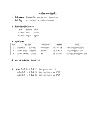 ขาไลแมลงวัน ( Galangal with Puching Flies) คําสําคัญ ปริมาณน้ําคั้นจากขามีผลตอการไลแมลงวัน 2) ชื่อนักเรียนผูทําโครงงาน 1. นาย สุรเกียรติ กลิ่นดี 2.นางสาว สิริธร วงเวียน 3.นางสาว อรอุมา บุญไชย 3) ครูที่ปรึกษา คนที่ ชื่อ-สกุล สอนกลุมวิชา โทรศัพท? Email 1 นาย เดชมณี เนาวโรจน? วิทยาศาสตร? 0981049766 dnavaroj@gmail.com 2 นางสาว ยาใจ เจริญพงษ? ชีวะวิทยา 0862506414 yajaicha@gmail.com 3 นางสาว แสงเดือน บกนSอย เคมี 0872463509 saengduanbn@gmail.com 4) งบประมาณที่เสนอ 6,400 บาท 5) เสนอ ยื่นครั้งที่ 1 วันที่ 15 เดือน ตุลาคม พ.ศ. 2557 แกSไขครั้งที่ 2 วันที่ 10 เดือน พฤศจิกายน พ.ศ. 2557 แกSไขครั้งที่ 3 วันที่ 20 เดือน พฤศจิกายน พ.ศ. 2557