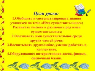 Документ описывает урок в основном классе, посвященный теме 'имя существительное', с целями обобщения знаний учащихся и развитием их навыков работы в коллективе. Урок включает различные активности, такие как мозговая атака и игра 'кто быстрей?', а также задания на понимание частей речи. Оборудование урока включает интерактивную доску, фишки и оценочный бланк, а также домашнее задание по упражнениям.