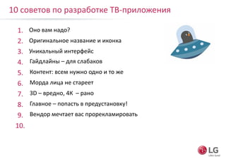 Документ содержит рекомендации по разработке приложений для смарт-ТВ, акцентируя внимание на уникальном интерфейсе и контенте. В нем обсуждаются особенности трансляции в России и статистика использования различных моделей смарт-ТВ, включая предпочтения пользователей по диагонали экранов и способам подключения. Также приводятся советы по обеспечению успешного продвижения приложения среди вендоров.