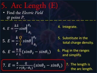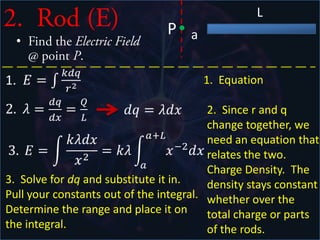 This document discusses electrostatics and electric potential through 5 sample problems. It outlines the general steps to take in solving for the electric field or potential. These include: 1) writing the equation, 2) determining charge density, 3) substituting the charge element, 4) integrating, 5) substituting total charge density, and 6) plugging in ranges and simplifying. The document explains how these steps remain the same but the specifics change depending on the geometry and properties of the situation.