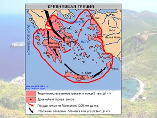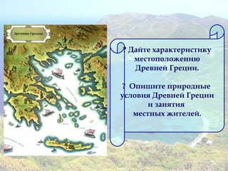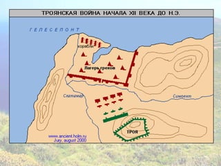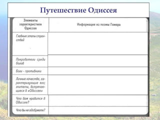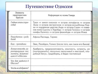 Документ посвящён поэмам Гомера «Илиада» и «Одиссея», а также описывает местоположение и природные условия древней Греции, а также мифы, связанные с Троянской войной. В нём обсуждаются ключевые персонажи и события, такие как гнев Ахиллеса, поединок Ахиллеса с Гектором и путешествия Одиссея. В конце указаны ссылки на дополнительные материалы и задания для учащихся.