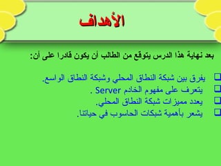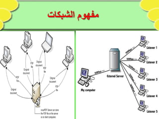 يتناول الوثيقة تعريف الشبكات المحلية والواسعة النطاق ومميزاتها، وأهمية الخوادم في هذه الشبكات. كما يستعرض الفرق بين الشبكتين وكيف يمكن استخدام التطبيقات لنقل البيانات بسهولة، بالإضافة إلى قواعد الأمان المتعلقة بالوصول إلى المعلومات. تشدد الوثيقة على دور المدارس في تعليم هذه المفاهيم للطلاب.