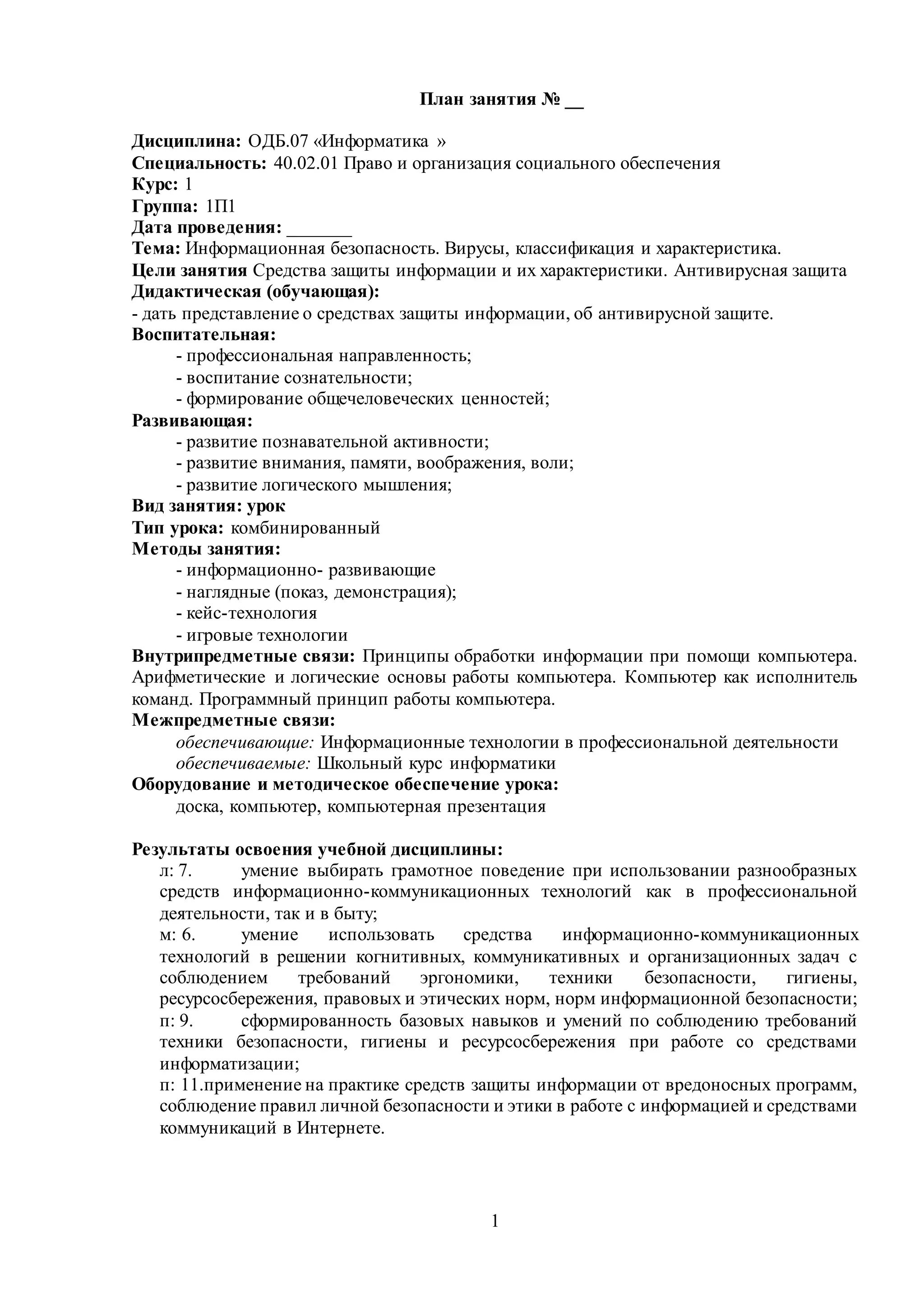 Документ представляет собой план занятия по информатике, посвященный теме информационной безопасности и антивирусной защите. Цели занятия включают ознакомление студентов со средствами защиты информации, развитие их познавательной активности и логического мышления. В нем также рассматриваются различные методы антивирусной защиты и меры, направленные на предотвращение угроз информационной безопасности.