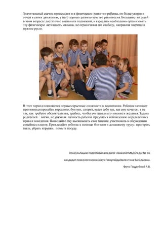 Документ описывает особенности развития пятилетних детей, включая формирование черт характера, активное познание мира и развитие воображения. Рекомендуется вовлекать детей в словесные игры, чтение и творческие занятия для улучшения их речи и интеллекта. Также подчеркиваются сложности в воспитании, когда дети начинают проявлять самостоятельность и требуют учета своего мнения.