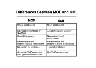 The document discusses metamodeling and the Model Driven Architecture (MDA). It provides an overview of model driven engineering and metamodeling. Specifically, it discusses how metamodels define the structure of models through concepts like classes and relationships. The Model Driven Architecture uses metamodels and modeling to develop software systems from models.