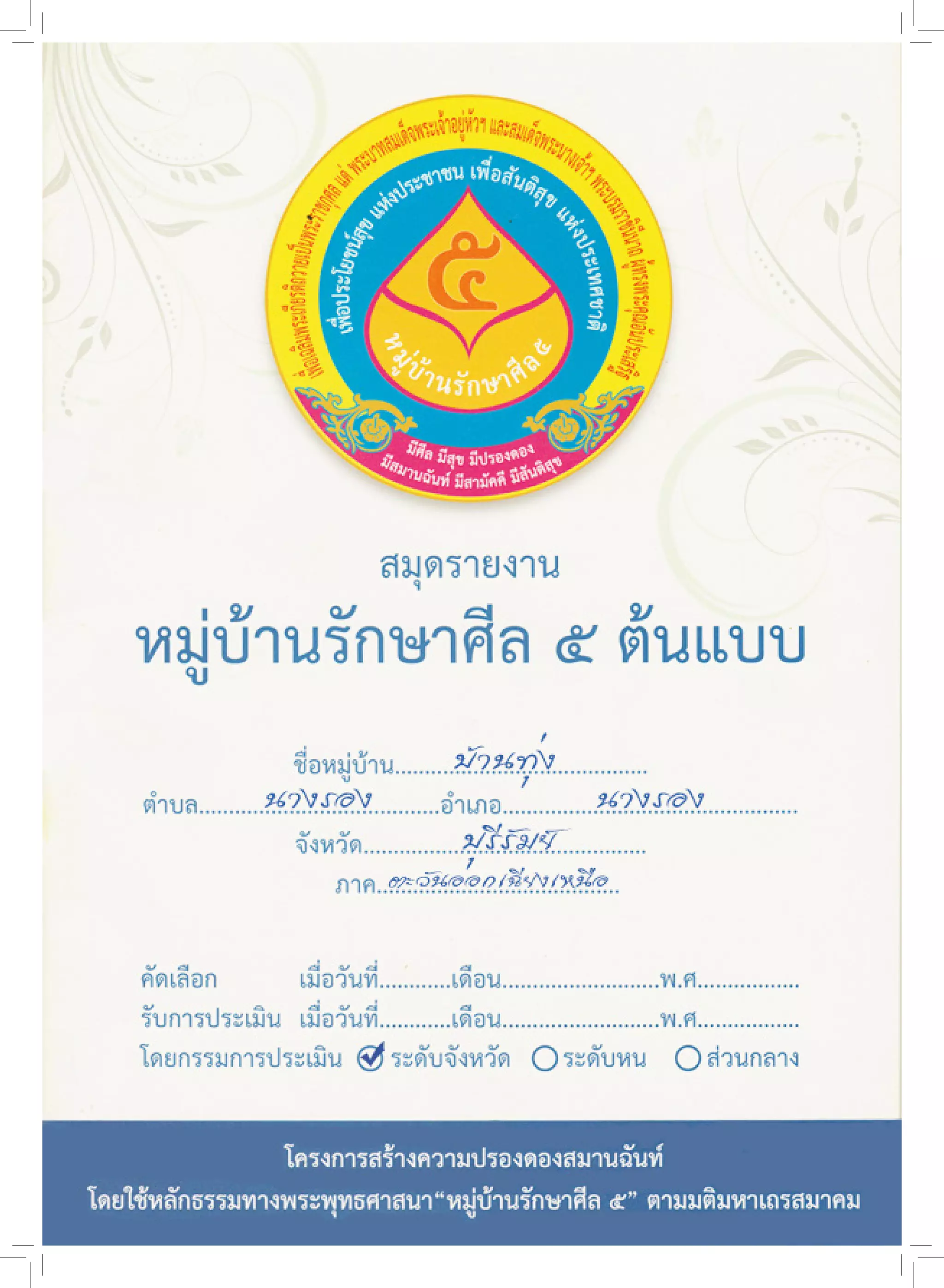 ๕ อธิบายกิจกรรม วันเวลา และสถานที่ ๕ กุมภาพันธ์ ๒๕๕๘ ณ ศาลากลางหมู่บ้าน ในการประชุมประจ�ำเดือนของหมู่บ้านทุ่ง มีการ ประชาสัมพันธ์เชิญชวนและรณรงค์ให้ปฏิบัติตนเป็นคนดี ละชั่วกลัวบาป โดยการร่วมกรอกใบสมัคร เป็นครอบครัวรักษาศีล ๕ และเน้นย�้ำเชิญชวนทุกเดือนในช่วงของการประชุมประชาคม
