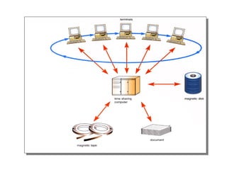 The document discusses the architecture and components of a computer system. It describes the layered structure including hardware, operating systems, and application software. It defines operating systems as system software that acts as an interface between users and hardware, controlling resources and peripheral devices. The document also summarizes common operating system types and functions such as file management, memory allocation, and interfacing with applications.