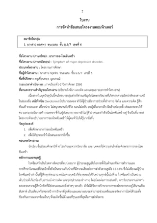 ชนะแสน ชั้น ม.6/7 เลขที่ 6 ชื่อโครงงาน (ภาษาไทย) : อาการของโรคซึมเศร้า ชื่อโครงงาน (ภาษาอังกฤษ) : Symptom of major depressive disorder. ประเภทโครงงาน : โครงงานการศึกษา ชื่อผู้ทาโครงงาน : นางสาว กฤตพร ชนะแสน ชั้น ม.6/7 เลขที่ 6 ชื่อที่ปรึกษา : ครูเขื่อนทอง มูลวรรณ์ ระยะเวลาดาเนินงาน : ภาคเรียนที่1-2 ปีการศึกษา 2560 ที่มาและความสาคัญของโครงงาน (อธิบายถึงที่มา แนวคิด และเหตุผล ของการทาโครงงาน) เนื่องจากในยุคปัจจุบันนี้คนไทยบางกลุ่มต่างก็ต่างเผชิญกับโรคทางจิตเวชที่เกิดจากความผิดปกติของสารเคมี ในสมองชื่อ เซโรโทนิน (Serotonin) มีปริมาณลดลง ทาให้ผู้ป่วยมีอาการป่วยทั้งร่างกาย จิตใจ และความคิด รู้สึก ท้อแท้ หงอยเหงา เบื่อหน่าย ไม่สนุกสนานกับชีวิต นอนไม่หลับ สะดุ้งตื่นกลางดึก ฝันร้ายบ่อยครั้ง ส่งผลกระทบให้ ความสามารถในการทางานลดลง ซึ่งในผู้ป่วยบางรายอาจยังไม่รู้ตัวว่าตนเองกาลังเป็นโรคซึมเศร้าอยู่ จึงเป็นที่มาของ โครงงานที่จะอธิบายอาการของโรคซึมเศร้าให้ผู้คนทั่วไปได้รู้มากยิ่งขึ้น วัตถุประสงค์ 1. เพื่อศึกษาอาการของโรคซึมเศร้า 2. เพื่อให้ทุกคนเข้าใจในตนเองมากยิ่งขึ้น ขอบเขตโครงงาน นักเรียนชั้นมัธยมศึกษาปีที่ 6 โรงเรียนยุพราชวิทยาลัย และ บุคคลที่มีความสนใจที่จะศึกษาอาการของโรค ซึมเศร้า หลักการและทฤษฎี โรคซึมเศร้าเป็นโรคทางจิตเวชที่พบบ่อยมาก ผู้ป่วยจะสูญเสียโอกาสทั้งในด้านอาชีพการทางานและ การศึกษาในขณะที่ป่วยอีกทั้งยังเป็นความเจ็บป่วยที่มีความเสี่ยงต่อการฆ่าตัวตายสูงถึง 15-18% ซึ่งไม่เพียงแต่ผู้ป่วย โรคซึมเศร้าเท่านั้นที่รู้สึกทุกข์ทรมาน คนในครอบครัวก็ต้องพลอยได้รับความทุกข์นั้นไปด้วย โรคซึมเศร้าเป็นความ เจ็บป่วยที่เกี่ยวข้องกับอารมณ์ ความคิด และทุกๆส่วนของร่างกาย โดยมีผลต่อการนอนหลับ การรับประทานอาหาร ตลอดจนความรู้สึกนึกคิดที่มีต่อตนเองและสิ่งต่างๆ รอบตัว ถ้าไม่ได้รับการรักษาอาการของโรคอาจคงอยู่ได้นานเป็น สัปดาห์ เป็นเดือนหรือหลายปี การรักษาที่ถูกต้องและเหมาะสมจะสามารถช่วยเหลือและขจัดอาการโรคได้รวมทั้ง ป้องกันภาวะแทรกซ้อนอื่นๆ ที่จะเกิดขึ้นได้ และที่รุนแรงที่สุดคือการฆ่าตัวตาย
