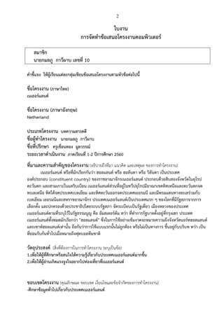 10 คาชี้แจง ให้ผู้เรียนแต่ละกลุ่มเขียนข้อเสนอโครงงานตามหัวข้อต่อไปนี้ ชื่อโครงงาน (ภาษาไทย) เนเธอร์แลนด์ ชื่อโครงงาน (ภาษาอังกฤษ) Netherland ประเภทโครงงาน บทความสารคดี ชื่อผู้ทาโครงงาน นายกมลภู กาวีผาบ ชื่อที่ปรึกษา ครูเขื่อนทอง มูลวรรณ์ ระยะเวลาดาเนินงาน ภาคเรียนที่ 1-2 ปีการศึกษา 2560 ที่มาและความสาคัญของโครงงาน (อธิบายถึงที่มา แนวคิด และเหตุผล ของการทาโครงงาน) เนเธอร์แลนด์ หรือที่มักเรียกกันว่า ฮอลแลนด์ หรือ ฮอลันดา หรือ วิลันดา เป็นประเทศ องค์ประกอบ (constituent country) ของราชอาณาจักรเนเธอร์แลนด์ ประกอบด้วยสิบสองจังหวัดในยุโรป ตะวันตก และสามเกาะในแคริบเบียน เนเธอร์แลนด์ส่วนที่อยู่ในทวีปยุโรปมีอาณาเขตทิศเหนือและตะวันตกจด ทะเลเหนือ ทิศใต้จดประเทศเบลเยียม และทิศตะวันออกจดประเทศเยอรมนี และมีพรมแดนทางทะเลร่วมกับ เบลเยียม เยอรมนีและสหราชอาณาจักร ประเทศเนเธอร์แลนด์เป็นประเทศแรก ๆ ของโลกที่มีรัฐสภาจากการ เลือกตั้ง และปกครองด้วยประชาธิปไตยระบบรัฐสภา จัดระเบียบเป็นรัฐเดี่ยว เมืองหลวงของประเทศ เนเธอร์แลนด์ตามที่ระบุไว้ในรัฐธรรมนูญ คือ อัมสเตอร์ดัม ทว่า ที่ทาการรัฐบาลตั้งอยู่ที่กรุงเฮก ประเทศ เนเธอร์แลนด์ทั้งหมดมักเรียกว่า "ฮอลแลนด์" ซึ่งในการใช้อย่างเข้มงวดจะหมายความถึงจังหวัดนอร์ทฮอลแลนด์ และเซาท์ฮอลแลนด์เท่านั้น ถือกันว่าการใช้แบบแรกนั้นไม่ถูกต้อง หรือไม่เป็นทางการ ขึ้นอยู่กับบริบท ทว่า เป็น ที่ยอมรับกันทั่วไปเมื่อหมายถึงฟุตบอลทีมชาติ วัตถุประสงค์ (สิ่งที่ต้องการในการทาโครงงาน ระบุเป็นข้อ) 1.เพื่อให้ผู้ที่ศึกษาหรือสนใจได้ความรู้เกี่ยวกับประเทศเนเธอร์แลนด์มากขึ้น 2.เพื่อให้ผู้อ่านเกิดแรงจูงใจอยากไปท่องเที่ยวที่เนเธอร์แลนด์ ขอบเขตโครงงาน (คุณลักษณะ ขอบเขต เงื่อนไขและข้อจากัดของการทาโครงงาน) -ศึกษาข้อมูลทั่วไปเกี่ยวกับประเทศเนเธอร์แลนด์