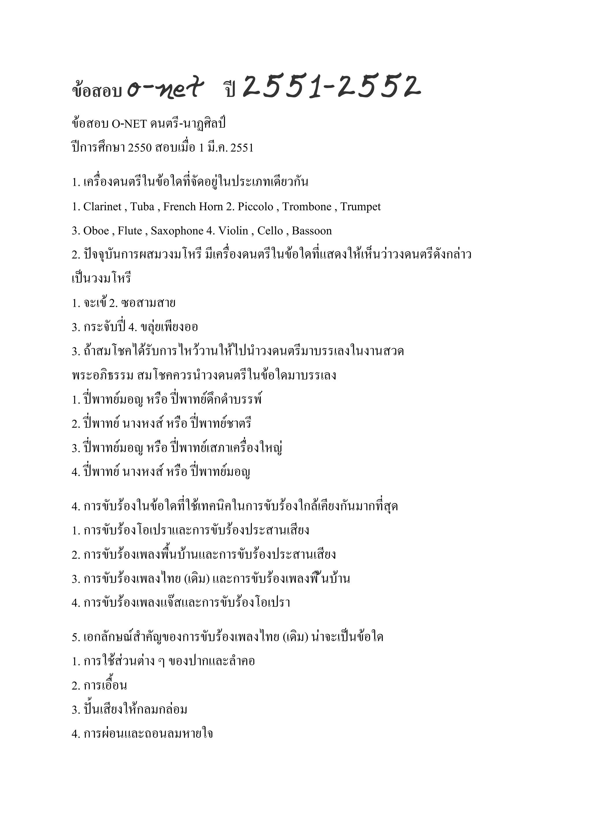 2551-2552 ข้อสอบ O-NET ดนตรี-นาฏศิลป์ ปีการศึกษา 2550 สอบเมื่อ 1 มี.ค. 2551 1. เครื่องดนตรีในข้อใดที่จัดอยู่ในประเภทเดียวกัน 1. Clarinet , Tuba , French Horn 2. Piccolo , Trombone , Trumpet 3. Oboe , Flute , Saxophone 4. Violin , Cello , Bassoon 2. ปัจจุบันการผสมวงมโหรี มีเครื่องดนตรีในข้อใดที่แสดงให้เห็นว่าวงดนตรีดังกล่าว เป็นวงมโหรี 1. จะเข้ 2. ซอสามสาย 3. กระจับปี่ 4. ขลุ่ยเพียงออ 3. ถ้าสมโชคได้รับการไหว้วานให้ไปนาวงดนตรีมาบรรเลงในงานสวด พระอภิธรรม สมโชคควรนาวงดนตรีในข้อใดมาบรรเลง 1. ปี่พาทย์มอญ หรือ ปี่พาทย์ดึกดาบรรพ์ 2. ปี่พาทย์ นางหงส์ หรือ ปี่พาทย์ชาตรี 3. ปี่พาทย์มอญ หรือ ปี่พาทย์เสภาเครื่องใหญ่ 4. ปี่พาทย์ นางหงส์ หรือ ปี่พาทย์มอญ 4. การขับร้องในข้อใดที่ใช้เทคนิคในการขับร้องใกล้เคียงกันมากที่สุด 1. การขับร้องโอเปราและการขับร้องประสานเสียง 2. การขับร้องเพลงพื้นบ้านและการขับร้องประสานเสียง 3. การขับร้องเพลงไทย (เดิม) และการขับร้องเพลงพื ้นบ้าน 4. การขับร้องเพลงแจ๊สและการขับร้องโอเปรา 5. เอกลักษณ์สาคัญของการขับร้องเพลงไทย (เดิม) น่าจะเป็นข้อใด 1. การใช้ส่วนต่าง ๆ ของปากและลาคอ 2. การเอื้อน 3. ปั้นเสียงให้กลมกล่อม 4. การผ่อนและถอนลมหายใจ