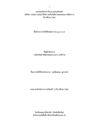 เทคโนโลยีสารสนเทศและการสื่อสาร 6 ปีการศึกษา 2560 ชื่อโครงงาน โรคไข้เลือดออก (Dengue fever) ชื่อผู้ทาโครงงาน 1.หลักทรัพย์ ศรีสุพรรณทอง ม.6/11 เลขที่ 30 ชื่ออาจารย์ที่ปรึกษาโครงงาน ครูเขื่อนทอง มูลวรรณ์ ระยะเวลาดาเนินงาน ภาคเรียนที่ 1-2 ปีการศึกษา 2560 โรงเรียนยุพราชวิทยาลัย จังหวัดเชียงใหม่ สานักงานเขตพื้นที่การศึกษามัธยมศึกษาเขต 34