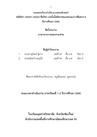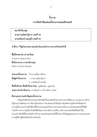 เทคโนโลยีสารสนเทศและการสื่อสาร 6 ปีการศึกษา 2560 ชื่อโครงงาน ภาษาทางกายของกระต่าย ชื่อผู้ทาโครงงาน 1. นายภานุวัฒน์ รู้มาก เลขที่ 43 ชั้น ม.6 ห้อง 5 2. นายชนินทร์ มอญไข่ เลขที่ 44 ชั้น ม.6 ห้อง 5 ชื่ออาจารย์ที่ปรึกษาโครงงาน ครูเขื่อนทอง มูลวรรณ์ ระยะเวลาดาเนินงาน ภาคเรียนที่ 1-2 ปีการศึกษา 2560 โรงเรียนยุพราชวิทยาลัย จังหวัดเชียงใหม่ สานักงานเขตพื้นที่การศึกษามัธยมศึกษาเขต 34