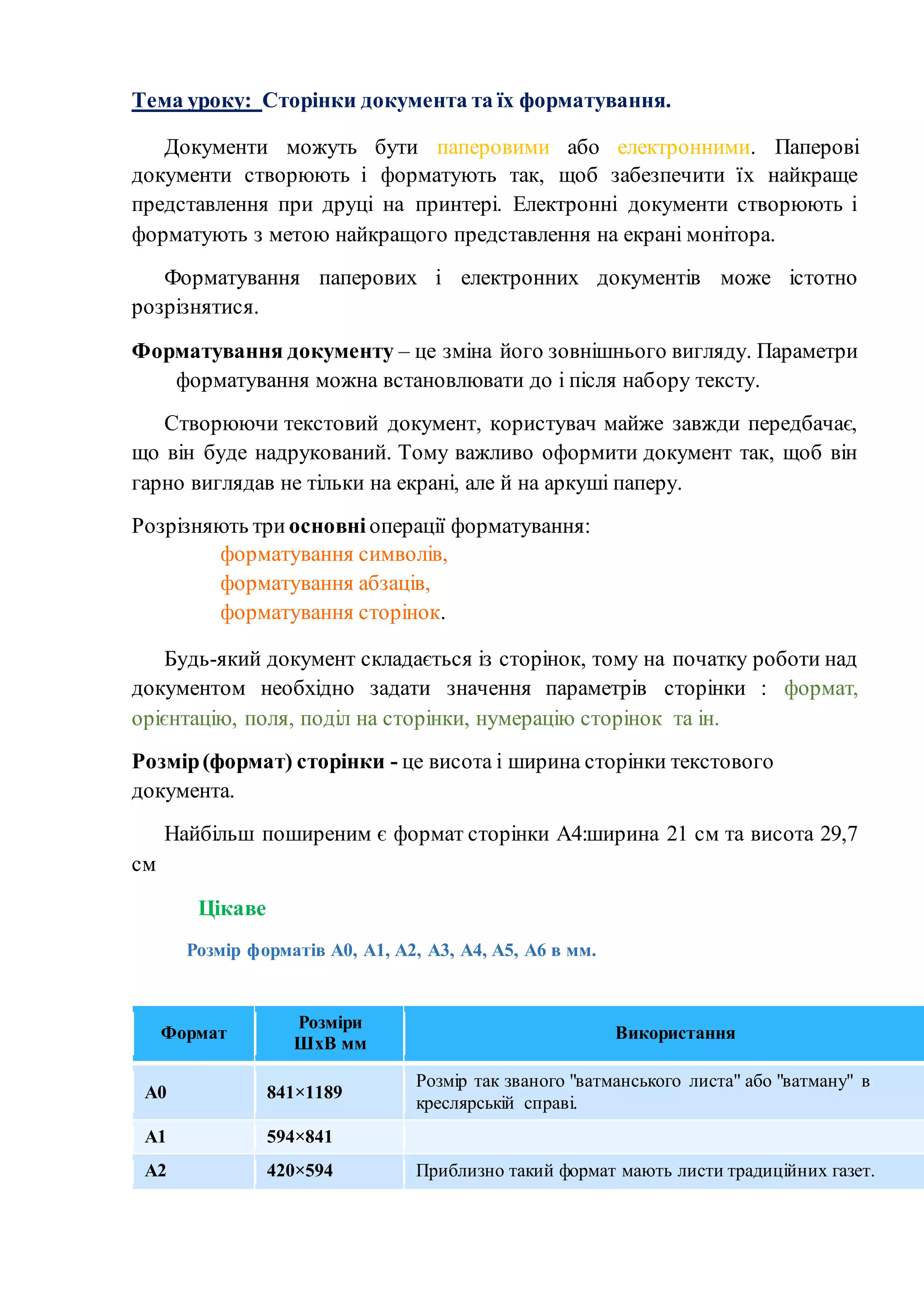 Тема уроку: Сторінкидокумента та їх форматування.