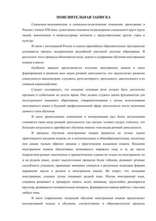 Документ представляет собой рабочую программу по английскому языку для 5-9 классов, утвержденную в соответствии с федеральными образовательными стандартами. В нем определены цели и задачи обучения, включая развитие коммуникативной, языковой и социокультурной компетенции учеников, а также формирование уважения к другим культурам и развитие толерантности. Программа описывает содержание курса и методические подходы, соответствующие современным требованиям образовательной системы.