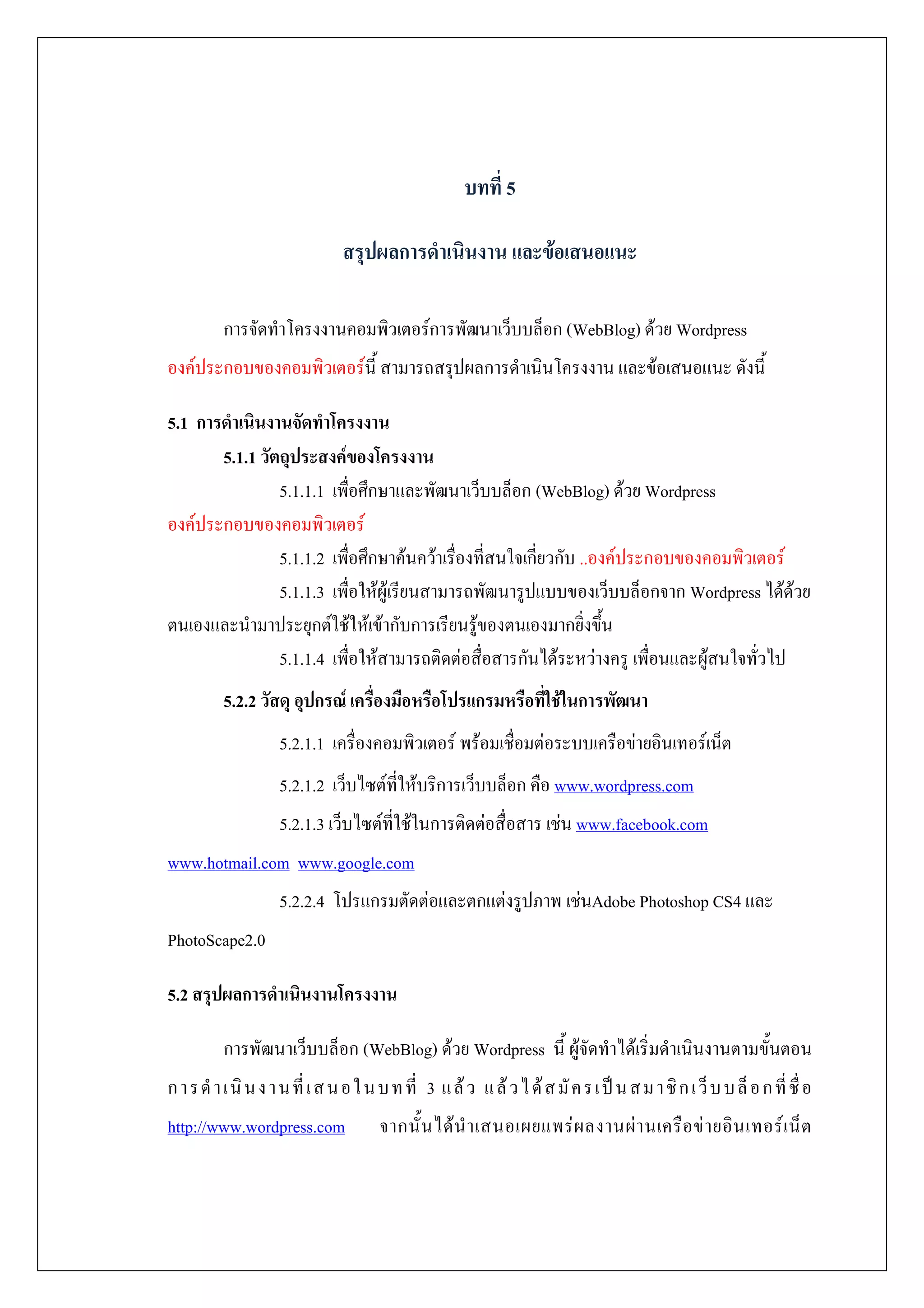 สรุปผลการดาเนินงาน และข้อเสนอแนะ การจัดทาโครงงานคอมพิวเตอร์การพัฒนาเว็บบล็อก (WebBlog) ด้วย Wordpress องค์ประกอบของคอมพิวเตอร์นี้ สามารถสรุปผลการดาเนินโครงงาน และข้อเสนอแนะ ดังนี้ 5.1 การดาเนินงานจัดทาโครงงาน 5.1.1 วัตถุประสงค์ของโครงงาน 5.1.1.1 เพื่อศึกษาและพัฒนาเว็บบล็อก (WebBlog) ด้วย Wordpress องค์ประกอบของคอมพิวเตอร์ 5.1.1.2 เพื่อศึกษาค้นคว้าเรื่องที่สนใจเกี่ยวกับ ..องค์ประกอบของคอมพิวเตอร์ 5.1.1.3 เพื่อให้ผู้เรียนสามารถพัฒนารูปแบบของเว็บบล็อกจาก Wordpress ได้ด้วย ตนเองและนามาประยุกต์ใช้ให้เข้ากับการเรียนรู้ของตนเองมากยิ่งขึ้น 5.1.1.4 เพื่อให้สามารถติดต่อสื่อสารกันได้ระหว่างครู เพื่อนและผู้สนใจทั่วไป 5.2.2 วัสดุ อุปกรณ์ เครื่องมือหรือโปรแกรมหรือที่ใช้ในการพัฒนา 5.2.1.1 เครื่องคอมพิวเตอร์ พร้อมเชื่อมต่อระบบเครือข่ายอินเทอร์เน็ต 5.2.1.2 เว็บไซต์ที่ให้บริการเว็บบล็อก คือ www.wordpress.com 5.2.1.3 เว็บไซต์ที่ใช้ในการติดต่อสื่อสาร เช่น www.facebook.com www.hotmail.com www.google.com 5.2.2.4 โปรแกรมตัดต่อและตกแต่งรูปภาพ เช่นAdobe Photoshop CS4 และ PhotoScape2.0 5.2 สรุปผลการดาเนินงานโครงงาน การพัฒนาเว็บบล็อก (WebBlog) ด้วย Wordpress นี้ ผู้จัดทาได้เริ่มดาเนินงานตามขั้นตอน ก า ร ด า เ นิ น ง า น ที่ เ ส น อ ใ น บ ท ที่ 3 แ ล้ ว แ ล้ ว ไ ด้ ส มั ค ร เ ป็ น ส ม า ชิ ก เ ว็ บ บ ล็ อ ก ที่ ชื่ อ http://www.wordpress.com จากนั้ น ได้ น าเสนอเผยแพร่ ผ ลงานผ่ า นเครื อ ข่ า ยอิ น เทอร์ เ น็ ต