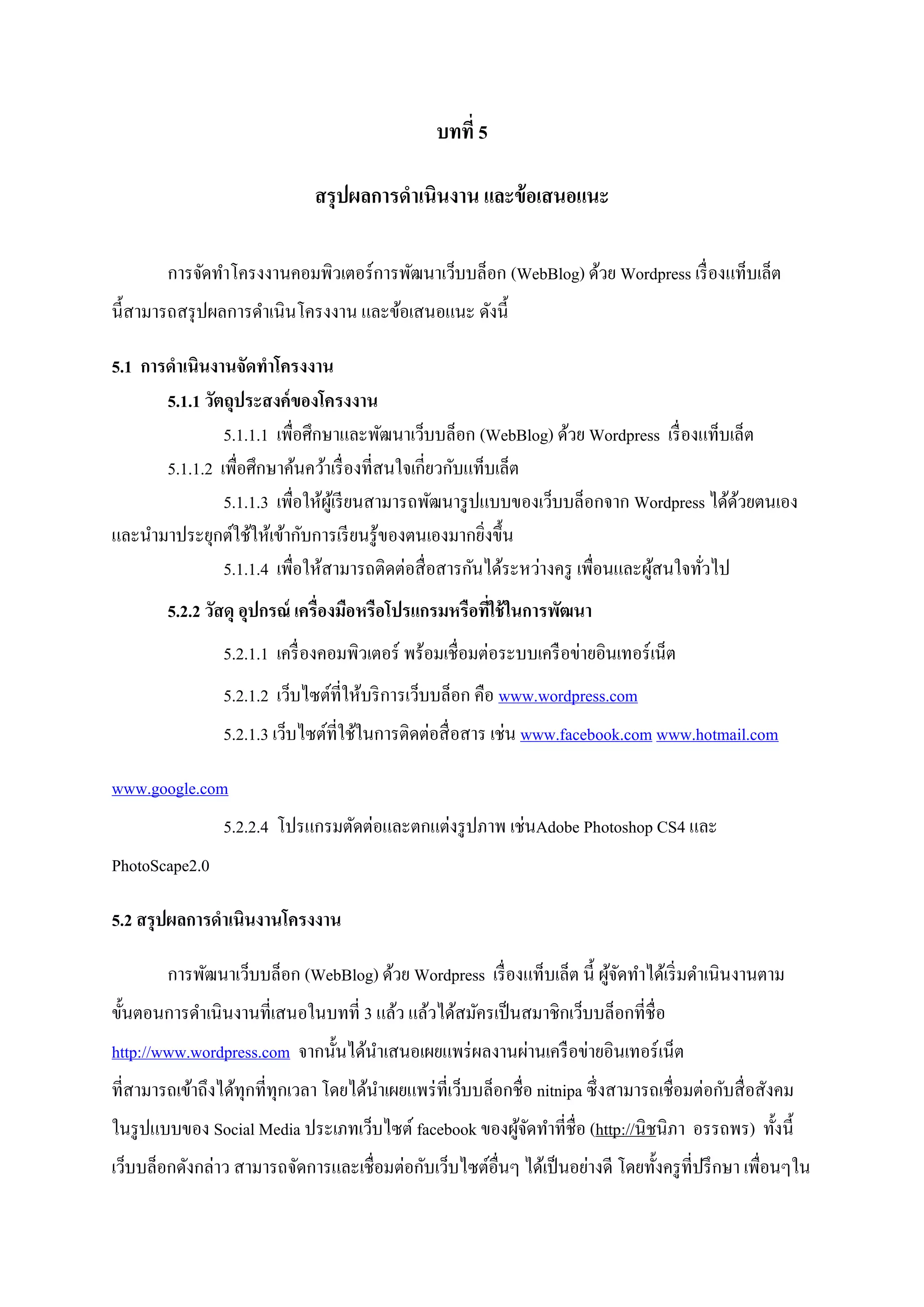 สรุปผลการดาเนินงาน และข้ อเสนอแนะ การจัดทาโครงงานคอมพิวเตอร์การพัฒนาเว็บบล็อก (WebBlog) ด้วย Wordpress เรื่ องแท็บเล็ต นี้สามารถสรุ ปผลการดาเนินโครงงาน และข้อเสนอแนะ ดังนี้ 5.1 การดาเนินงานจัดทาโครงงาน 5.1.1 วัตถุประสงค์ ของโครงงาน 5.1.1.1 เพื่อศึกษาและพัฒนาเว็บบล็อก (WebBlog) ด้วย Wordpress เรื่ องแท็บเล็ต 5.1.1.2 เพื่อศึกษาค้นคว้าเรื่ องที่สนใจเกี่ยวกับแท็บเล็ต 5.1.1.3 เพื่อให้ผเู้ รี ยนสามารถพัฒนารู ปแบบของเว็บบล็อกจาก Wordpress ได้ดวยตนเอง ้ และนามาประยุกต์ใช้ให้เข้ากับการเรี ยนรู ้ของตนเองมากยิ่งขึ้น 5.1.1.4 เพื่อให้สามารถติดต่อสื่ อสารกันได้ระหว่างครู เพื่อนและผูสนใจทัวไป ้ ่ 5.2.2 วัสดุ อุปกรณ์ เครื่องมือหรือโปรแกรมหรือทีใช้ ในการพัฒนา ่ 5.2.1.1 เครื่ องคอมพิวเตอร์ พร้อมเชื่ อมต่อระบบเครื อข่ายอินเทอร์ เน็ต 5.2.1.2 เว็บไซต์ที่ให้บริ การเว็บบล็อก คือ www.wordpress.com 5.2.1.3 เว็บไซต์ท่ีใช้ในการติดต่อสื่ อสาร เช่น www.facebook.com www.hotmail.com www.google.com 5.2.2.4 โปรแกรมตัดต่อและตกแต่งรู ปภาพ เช่นAdobe Photoshop CS4 และ PhotoScape2.0 5.2 สรุ ปผลการดาเนินงานโครงงาน การพัฒนาเว็บบล็อก (WebBlog) ด้วย Wordpress เรื่ องแท็บเล็ต นี้ ผูจดทาได้เริ่ มดาเนินงานตาม ้ั ขั้นตอนการดาเนิ นงานที่เสนอในบทที่ 3 แล้ว แล้วได้สมัครเป็ นสมาชิกเว็บบล็อกที่ชื่อ http://www.wordpress.com จากนั้นได้นาเสนอเผยแพร่ ผลงานผ่านเครื อข่ายอินเทอร์ เน็ต ที่สามารถเข้าถึงได้ทุกที่ทุกเวลา โดยได้นาเผยแพร่ ที่เว็บบล็อกชื่อ nitnipa ซึ่ งสามารถเชื่อมต่อกับสื่ อสังคม ในรู ปแบบของ Social Media ประเภทเว็บไซต์ facebook ของผูจดทาที่ชื่อ (http://นิชนิภา อรรถพร) ทั้งนี้ ้ั เว็บบล็อกดังกล่าว สามารถจัดการและเชื่อมต่อกับเว็บไซต์อื่นๆ ได้เป็ นอย่างดี โดยทั้งครู ที่ปรึ กษา เพื่อนๆใน