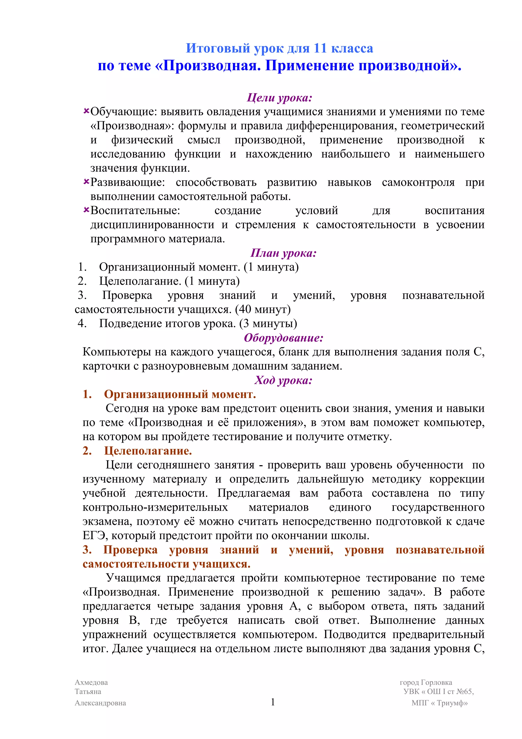Итоговый урок для 11 класса посвящен теме 'производная и ее применение', целью которого является проверка знаний студентов с помощью компьютерного тестирования. Урок включает организационный момент, целеполагание и подведение итогов, а также выполнение заданий различных уровней сложности с последующей оценкой. Учитель предоставляет инструкции по выполнению заданий и коррекции учебной деятельности на основе полученных оценок.