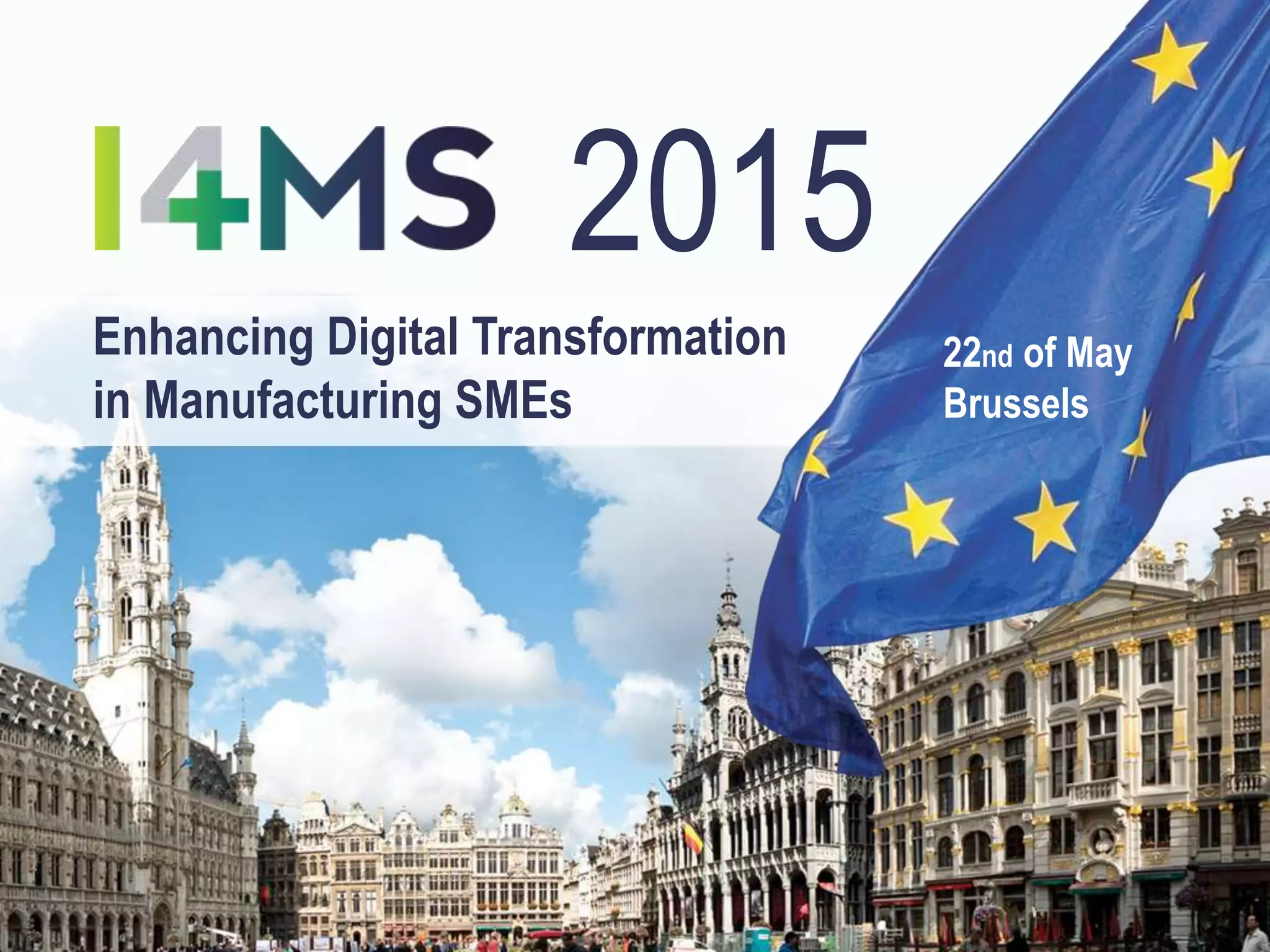 The document outlines the i4ms initiative aimed at enhancing digital transformation in manufacturing SMEs, focusing on three industry-relevant challenges introduced in April 2014. It details the structured approach involving simulation contests, collaboration among technology developers and end-users, and various stages leading to field tests. The initiative aims to foster technology transfer from academia to industry and includes a grant budget of €7 million for challengers.
