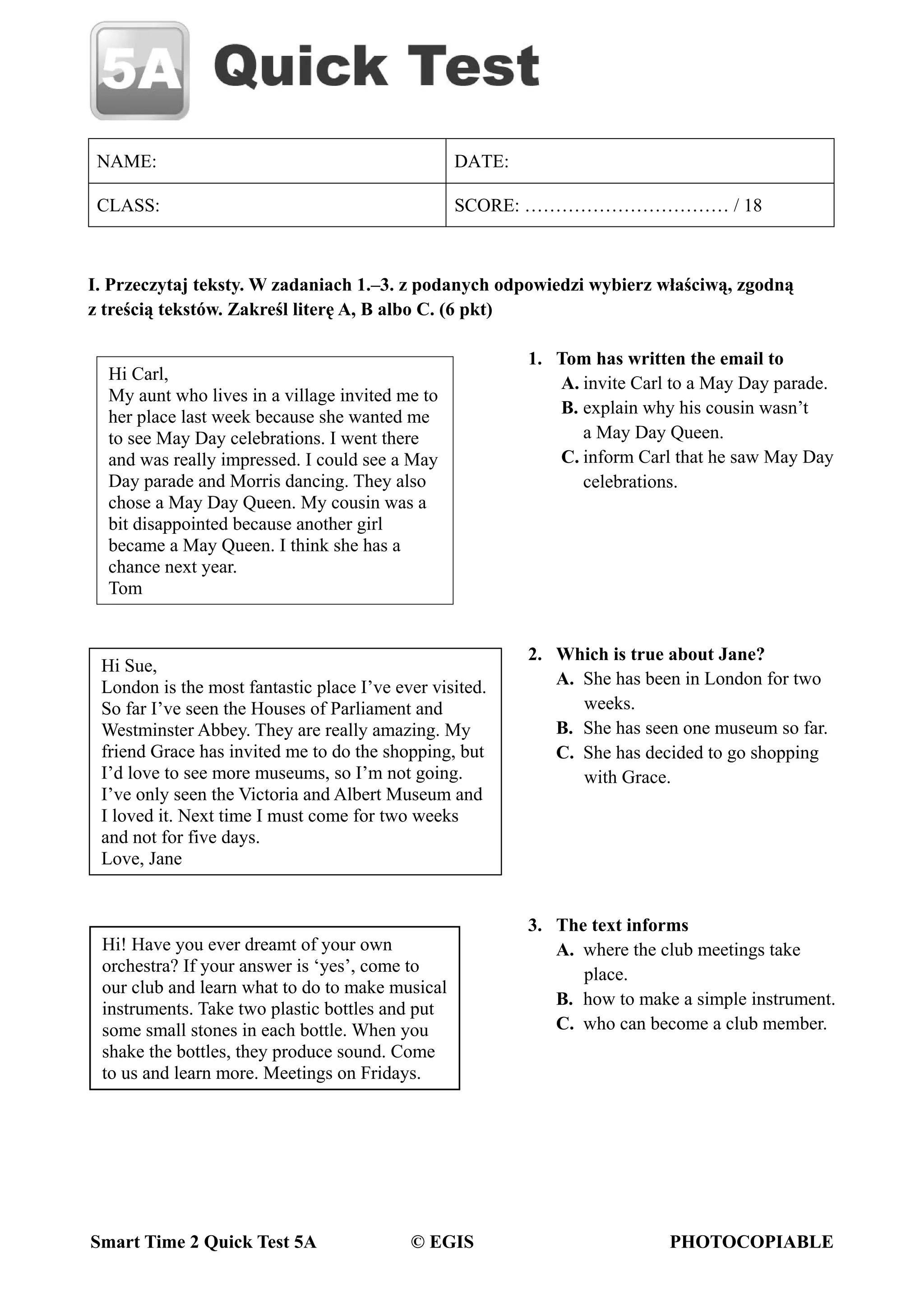 This document appears to be a student's test on English comprehension and grammar. It contains questions about short texts regarding May Day celebrations, visits to London museums, and starting a music club. The student is asked to choose the correct answers, underline the right word, fill in blanks, and complete sentences in the present perfect or past simple tense based on prompts. The test covers a range of topics and grammar concepts to assess the student's English language skills.