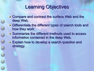 This chapter discusses accessing information resources on the web, including the difference between the surface web and deep web. It covers various search tools like search engines, subject directories, and meta search engines. Boolean logic and search syntax are explained to refine queries. Advanced search features and evaluating results are also summarized. Methods to define search questions and formulate strategies are provided to efficiently find relevant information online.