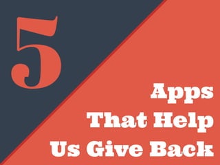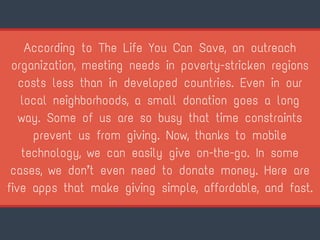 The document outlines five mobile apps that facilitate charitable giving, making it easier for users to support various global and local causes. Each app offers unique mechanisms for donations, such as donating photos, feeding children, or earning points through app usage. These apps leverage technology to encourage and simplify contributions in a meaningful way.