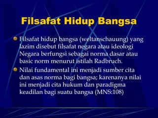 Pancasila berfungsi sebagai filsafat hidup dan filsafat negara bagi bangsa Indonesia yang menjadi pedoman dalam menetapkan cita hukum nasional dan cita negara. Kedudukan Pancasila sebagai norma dasar akan mengarahkan sistem hukum, ekonomi, dan politik Indonesia.