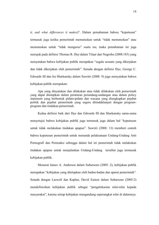 Dokumen ini membahas konsep kebijakan publik yang merupakan hasil dari keputusan pemerintah untuk mencapai tujuan tertentu melalui berbagai nilai dan praktik. Kebijakan publik mencakup keputusan untuk bertindak atau tidak bertindak, serta melibatkan proses mulai dari perumusan hingga evaluasi kebijakan. Berbagai model teori kebijakan, seperti yang dikemukakan oleh Anderson dan Dye, menggambarkan proses tersebut sebagai siklus yang melibatkan elemen-elemen yang saling mempengaruhi.