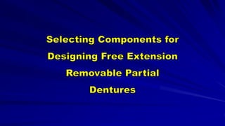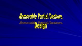 This document discusses the principles and factors involved in the design of removable partial dentures (RPDs) to ensure their effectiveness and minimize damage to dental structures. Key considerations include the health of abutment teeth, ridge conditions, and the biomechanical principles that guide the planning and alignment of the dentures. The aim is to achieve a secure and functional design that preserves existing tissues and supports masticatory efficiency while addressing the unique needs of patients.