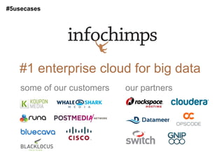 The document outlines five significant use cases for big data, emphasizing its importance in areas such as risk analysis and fraud detection, brand and sentiment analysis, customer behavior insights, targeted marketing, and regulatory compliance. It highlights the challenges and methodologies for integrating and analyzing vast amounts of diverse data to drive business decisions. Leveraging tools like Hadoop and statistical modeling enables organizations to capture valuable insights and enhance customer engagement.