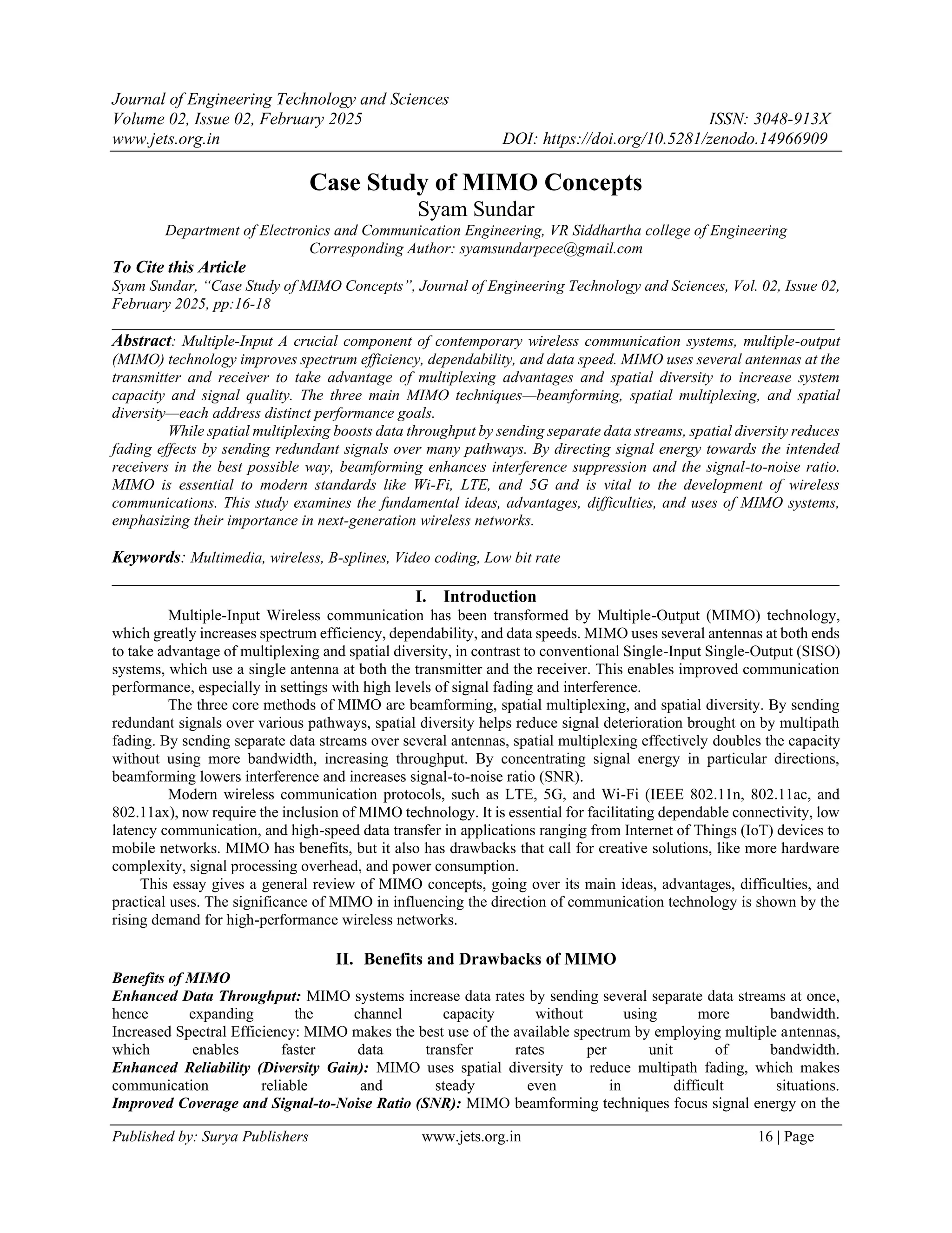 Syam Sundar, “Case Study of MIMO Concepts”, Journal of Engineering Technology and Sciences, Vol. 02, Issue 02,