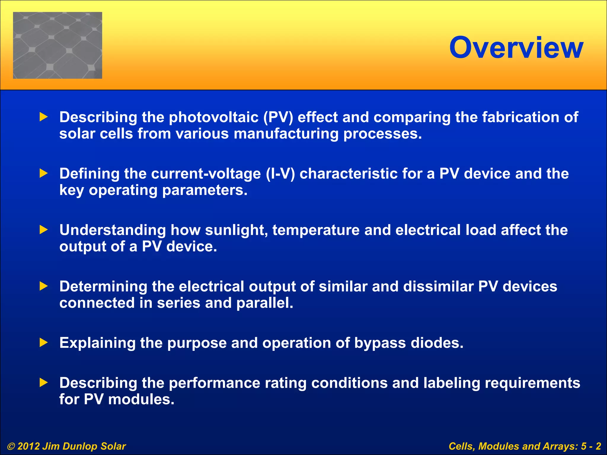This document discusses solar cells, modules, and arrays. It describes how solar cells convert sunlight to electricity via the photovoltaic effect. Silicon solar cells produce around 0.5-0.6 volts and their current output depends on area, efficiency, and irradiance. Modules are made by connecting cells in series and parallel and include glass, polymer backsheets, and frames. Arrays are built from modules and can be ground mounted, roof mounted, or building integrated. The document also examines I-V characteristics, efficiency, fill factor, and the effect of temperature and load on performance.