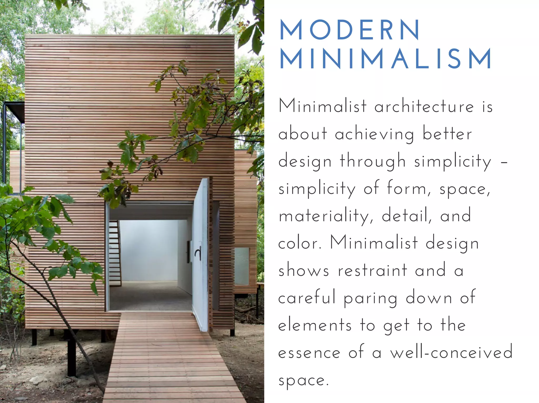 Minimalist architecture emphasizes simplicity in form, space, materiality, and color.