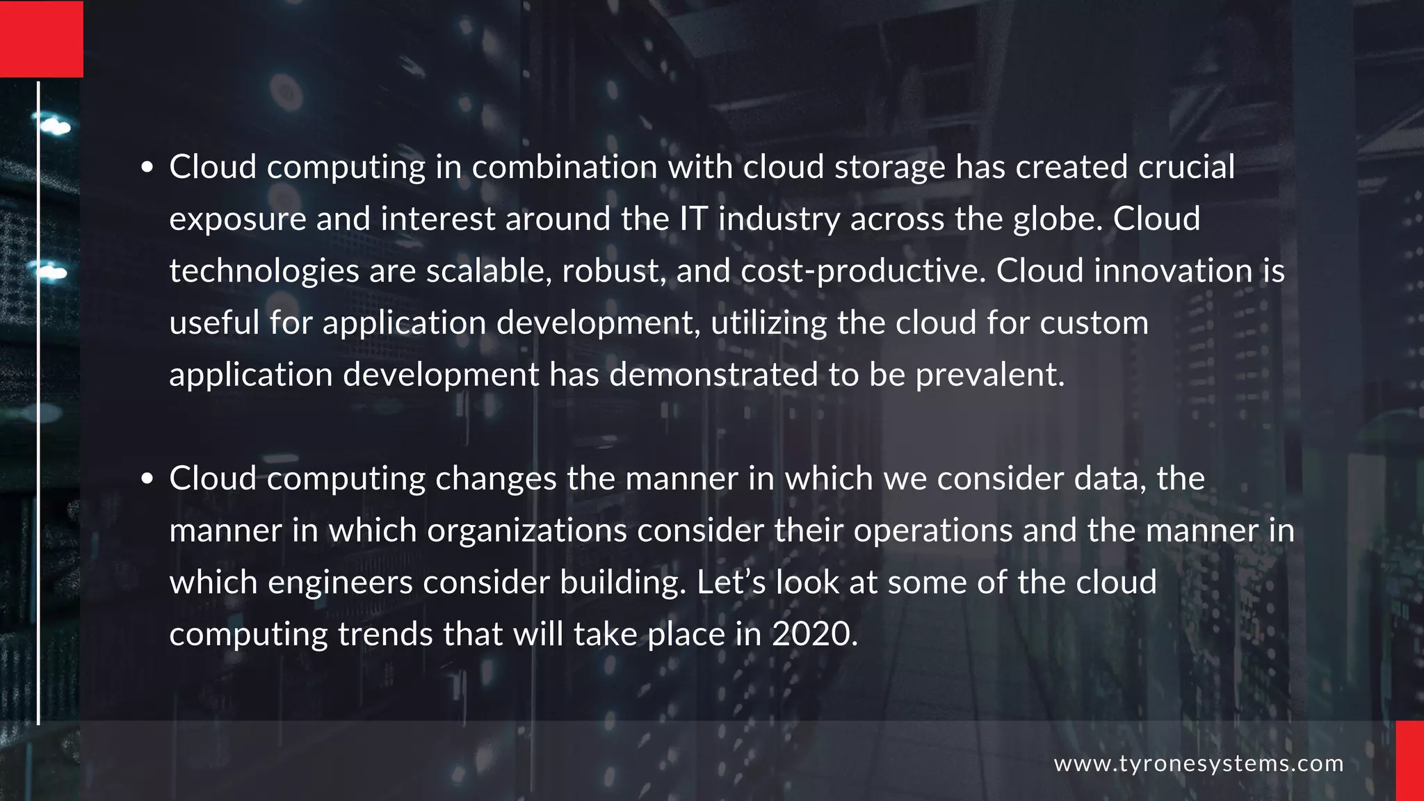 The document outlines five key trends in cloud computing for 2020, emphasizing the rise of serverless computing, edge computing for lower latency, the impact of quantum computing on processing speed, the emergence of 'digital natives' familiar with cloud technologies, and the increasing use of artificial intelligence to enhance business processes. These trends indicate a significant shift in how organizations utilize technology to improve efficiency and meet customer demands. Overall, the document highlights the transformative potential of cloud computing in various aspects of the IT industry.