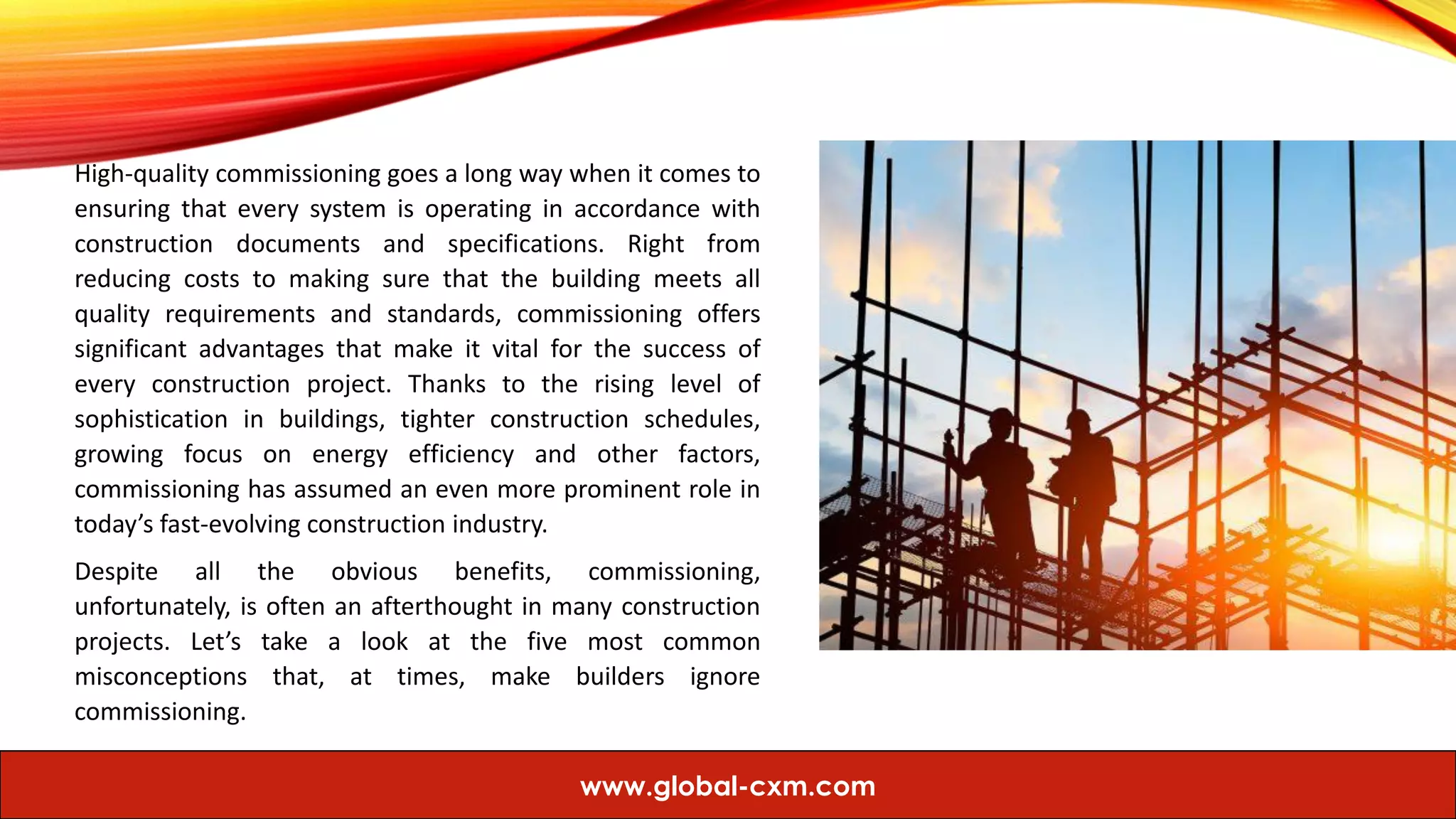 The document discusses five common misconceptions about commissioning in construction projects, emphasizing its essential role in ensuring buildings meet quality and efficiency standards. It highlights that commissioning is not unnecessary, not limited to new or large projects, and is a continuous process rather than a one-time event. Additionally, using commissioning management software can mitigate costs and enhance the overall performance of a building.