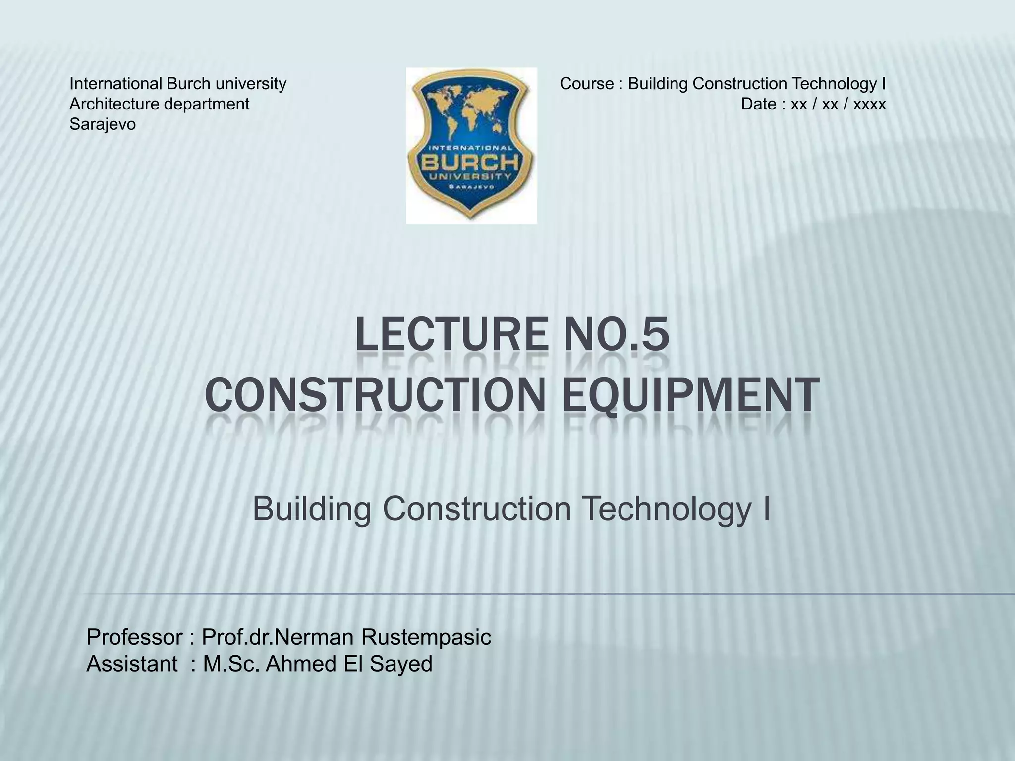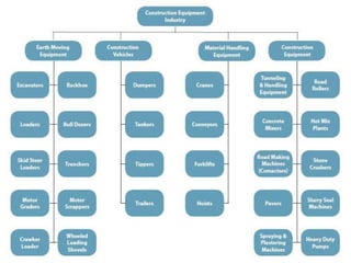 The document discusses various types of construction equipment used on building sites, including earthmoving equipment like excavators and bulldozers, construction vehicles like dump trucks and trailers, material handling equipment like cranes and forklifts, and other equipment like concrete mixers and compactors. It provides details on the purpose and function of each type of equipment, with examples of specific models within each category. The goal is to classify the wide variety of machines commonly found on construction sites based on their application and use.