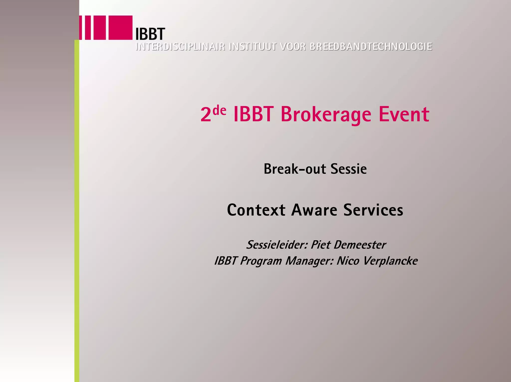 The document summarizes a session on context aware services from an IBBT Brokerage Event. The session chair was Piet Demeester and objectives included identifying research topics and interested parties. Topics discussed included the concept of context aware services, market potential, challenges, and requirements. Major challenges identified were accurate indoor positioning, different sensor types, communication between devices, and representing context information standardized. The session identified several interested parties and concluded that context detection infrastructure, context aware devices, service architectures, and addressing security, user requirements, and business models were important areas.