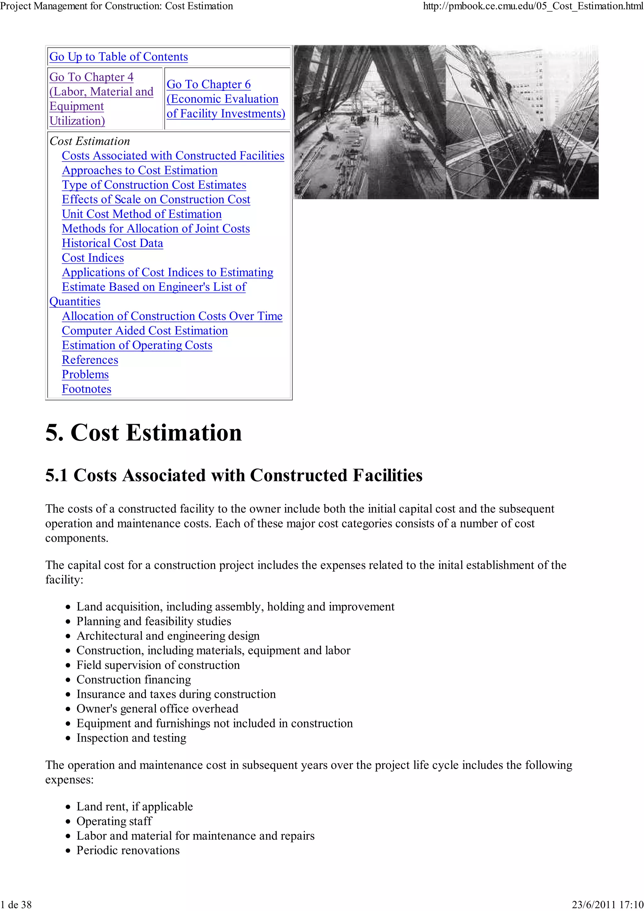 The document discusses cost estimation for construction projects. It describes the major categories of costs for a construction project, which include initial capital costs like construction, land acquisition, and design fees, as well as ongoing operation and maintenance costs. It also discusses approaches to cost estimation, including estimating based on historical cost data, unit costs, and computer-aided methods. Cost contingencies are also addressed.