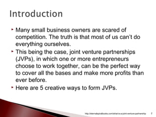The document discusses the benefits of joint venture partnerships (JVPs) for small business owners and entrepreneurs. It provides 5 creative ways to form JVPs, such as capitalizing on each other's strengths, co-creating products, and running webinars together. Entrepreneurs can leverage JVPs to cover more areas, make more profits, and boost their credibility through collaboration.