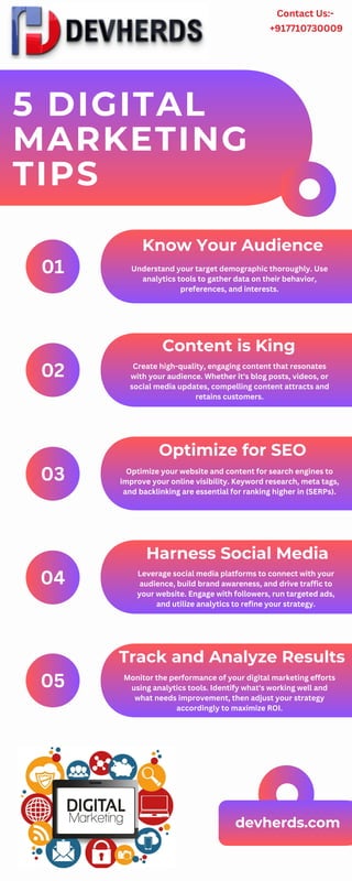 The document presents five key digital marketing tips: understand your audience, create quality content, optimize for SEO, utilize social media, and track results. It emphasizes the importance of analytics to tailor strategies and improve performance. Engaging content and active social media presence are highlighted as crucial for attracting and retaining customers.