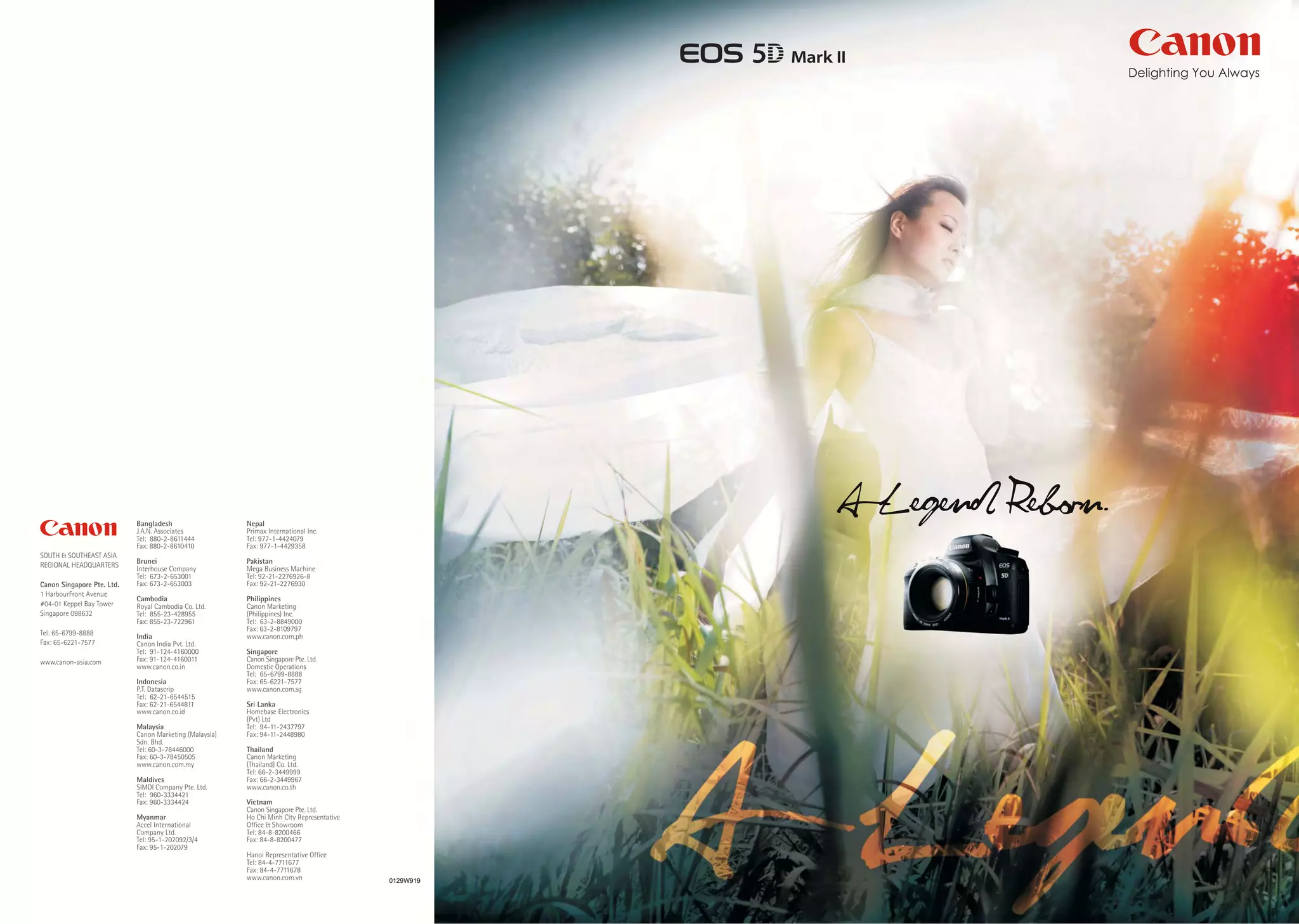 The document provides contact information for Canon's regional headquarters and authorized representatives in various countries across South and Southeast Asia. It lists the office addresses, phone and fax numbers for Canon entities and partners in Bangladesh, Nepal, Brunei, Cambodia, India, Indonesia, Malaysia, Maldives, Myanmar, Pakistan, Philippines, Singapore, Sri Lanka, Thailand, and Vietnam.