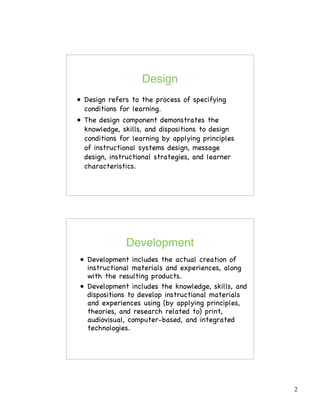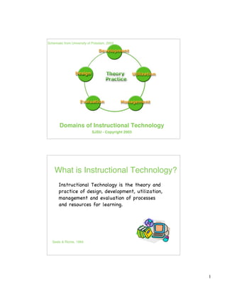 Instructional technology is the design, development, use, management and evaluation of resources and processes for learning. It involves designing instructional conditions, developing materials using various technologies, utilizing processes and resources for learning based on principles and research, managing instructional technology projects and systems, and evaluating instructional effectiveness.