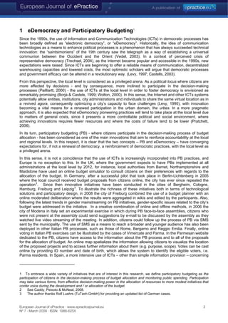 The paper discusses the implementation of e-participatory budgeting (e-PB) in Belo Horizonte, Brazil, highlighting its role in enhancing citizen participation in democratic processes through the use of information and communication technologies (ICTs). Despite low traditional participatory rates, the e-PB initiative achieved nearly 10% participation, revealing important factors such as the significance of public works and citizens' perceived impact on decision-making. The study aims to contribute to the literature on electronic democracy and participatory budgeting, evaluating the prospects and challenges of using ICTs in local governance.