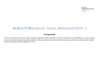 Fil argumental Scratchés l'eina utilitzada a Primària per introduir conceptes de programació i altres competències. En questa UD repassarem les eines treballades el curs anterior i afegirem de noves com el dibuix, els efectes i les variables. Aprendrem a utilitzar els codis que ens oferereix online Scratch per publicar els treballs en els blocs personals. Utilitzarem les eines de programació Scratch en anglès per fer el CLIL.