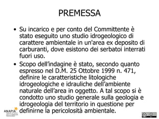 Il documento presenta uno studio idrogeologico di un'area contenente serbatoi di gasolio interrati dismessi, con lo scopo di valutare lo stato di contaminazione del sottosuolo e produrre un progetto di bonifica per un futuro uso residenziale. Sono state effettuate indagini in sito che hanno incluso prove penetrometriche e analisi chimiche dei terreni, scoprendo contaminazioni nel terreno a diverse profondità. L'area è classificata come a media vulnerabilità idrogeologica, con l'acquifero locale a una profondità di 8.50 metri, circondato da formazioni argillose impermeabili.