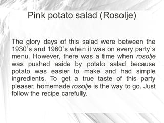 1. Pink potato salad (Rosolje) which contains beets, potatoes, carrots, herring, pickles, apples, and pork mixed with a sour cream dressing.
