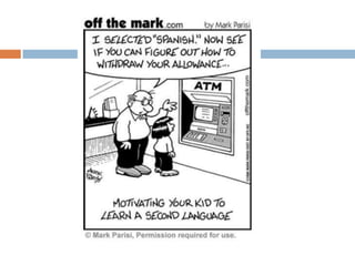 This document discusses factors that influence language learning strategies. It analyzes motivation, gender, experiences studying abroad, aptitude, and psychological/personality traits. The document reviews several studies that found females tend to use more memory and metacognitive strategies than males. Studying abroad was found to influence students' thinking and learning. Aptitude and personality were also deemed important factors as successful language learners have different strengths. The document concludes that determination, stable emotion, and strong mind control are needed to learn a new language.