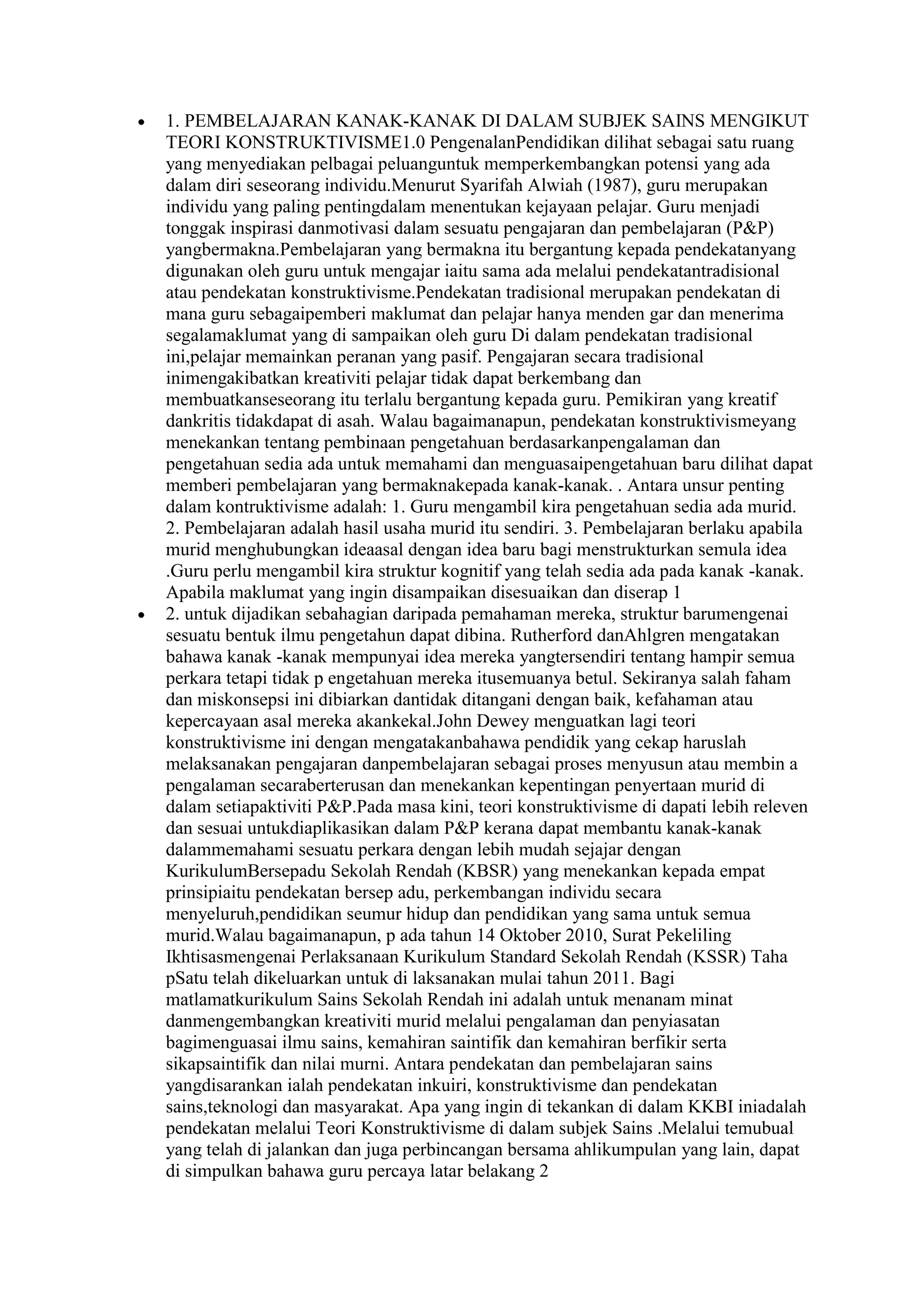 1. Dokumen tersebut membahas faktor-faktor yang mempengaruhi pembelajaran sains kanak-kanak menurut teori konstruktivisme, termasuk pengalaman sedia ada murid dan penyampaian guru.